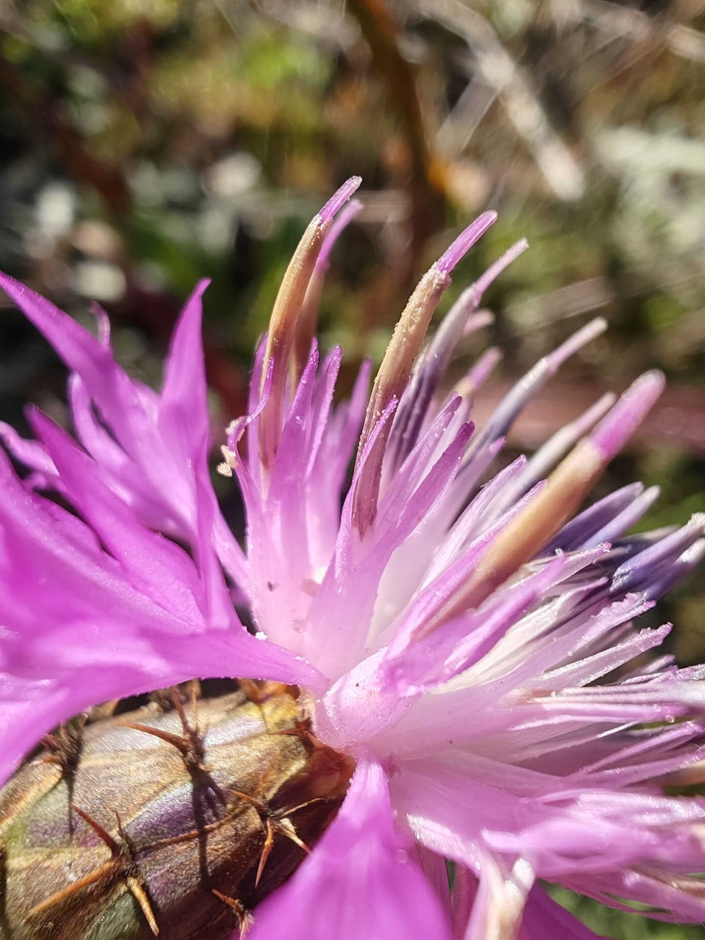 - Capitules : de 20 à 25mm de diamètre, fleurs rosées à pourprées. Involucre muni de bractées à appendices épineux en éventail.