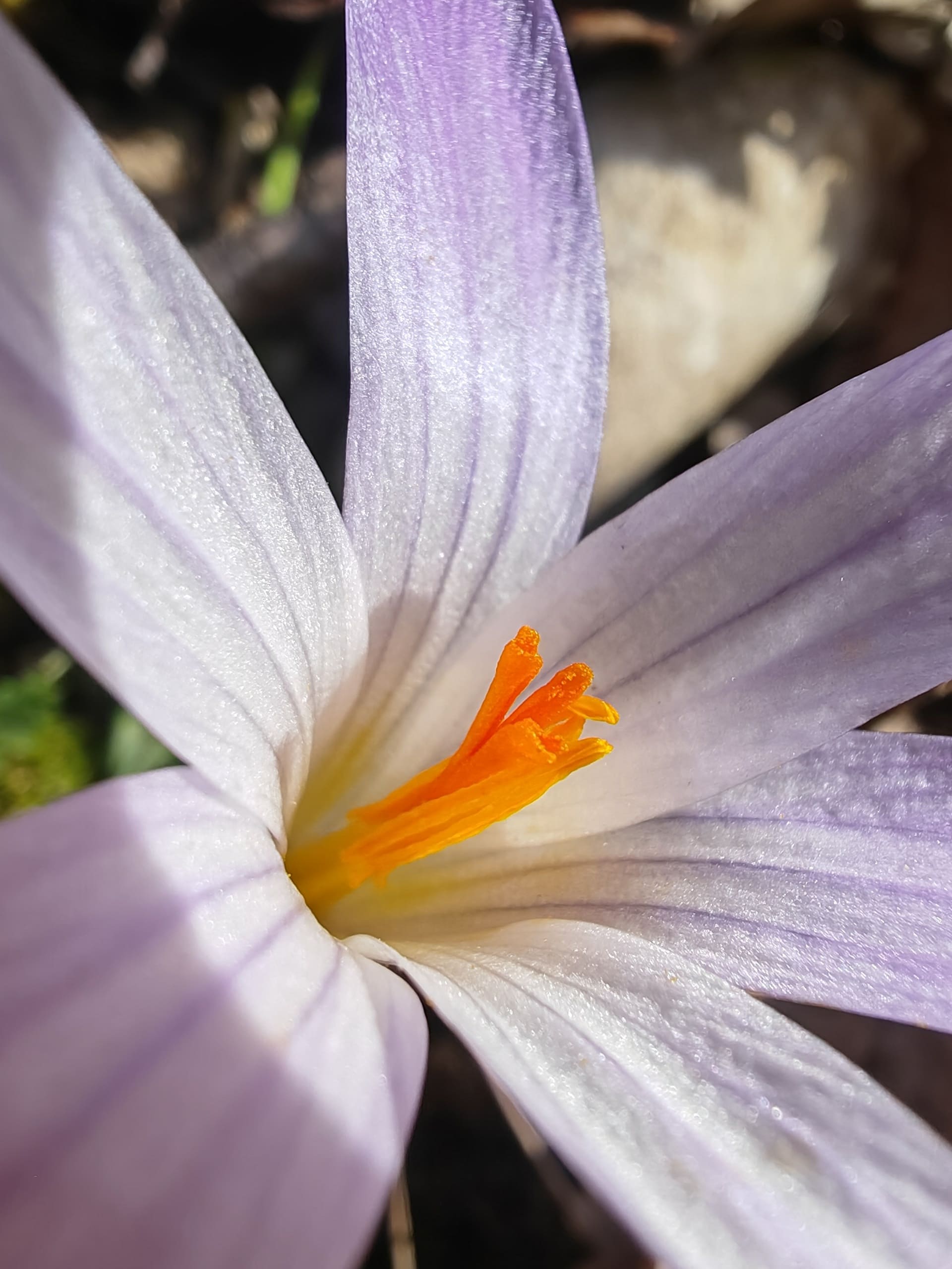 • Fleurs : Solitaires ou en petit nombre. Tépale violet pâle à blanc, strié de violet. Gorge jaune pâle. 3 étamines à anthères jaunes, style orangé.