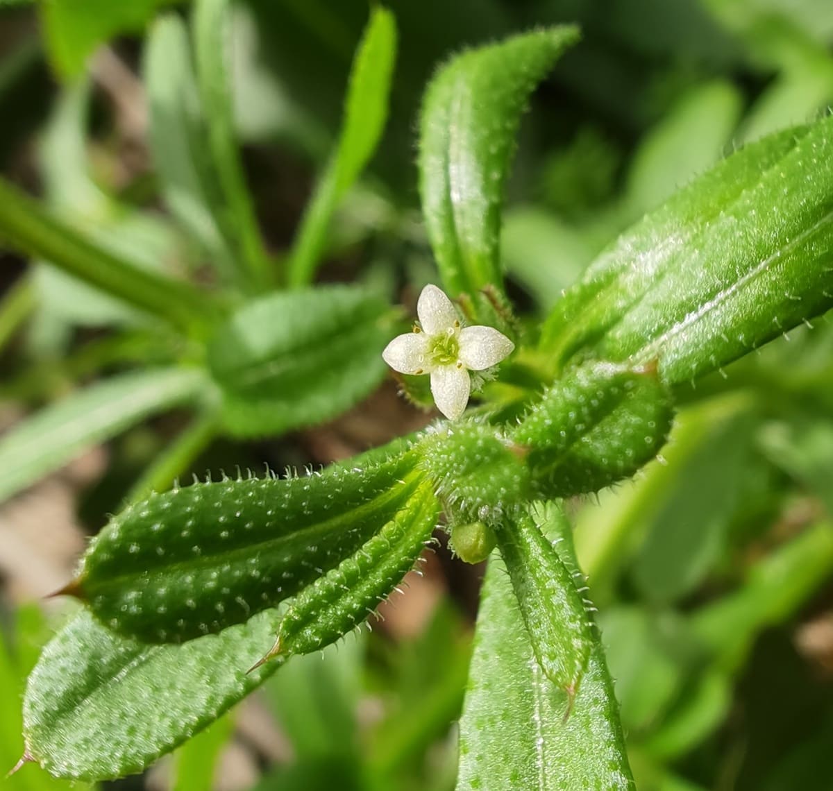 Le Gaillet gratteron est une plante annuelle très commune, célèbre pour sa capacité à s’agripper aux vêtements et aux poils des animaux grâce à de petits crochets.