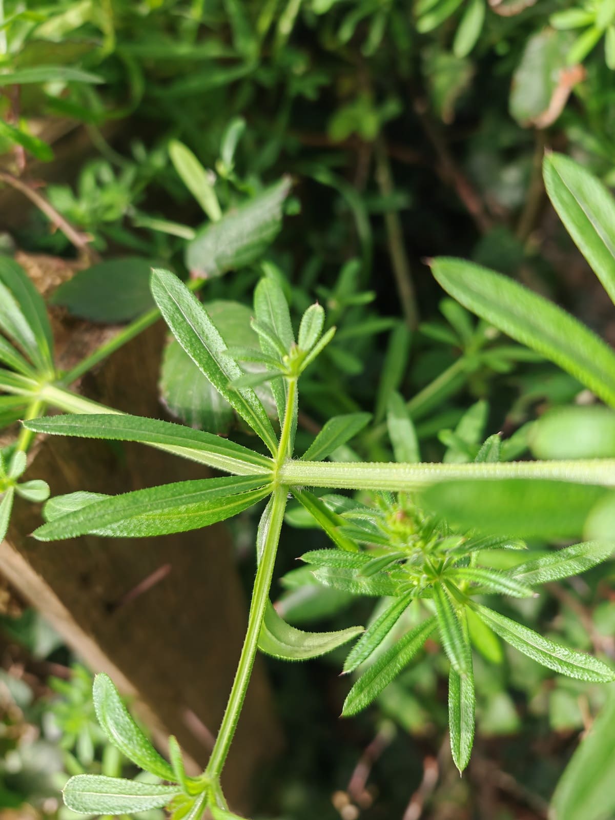 - Les feuilles sont disposées en verticilles de 6 à 8 autour de la tige. Elles sont linéaires-oblongues, avec une pointe mucronée. La face supérieure des feuilles est hérissée de poils crochus.