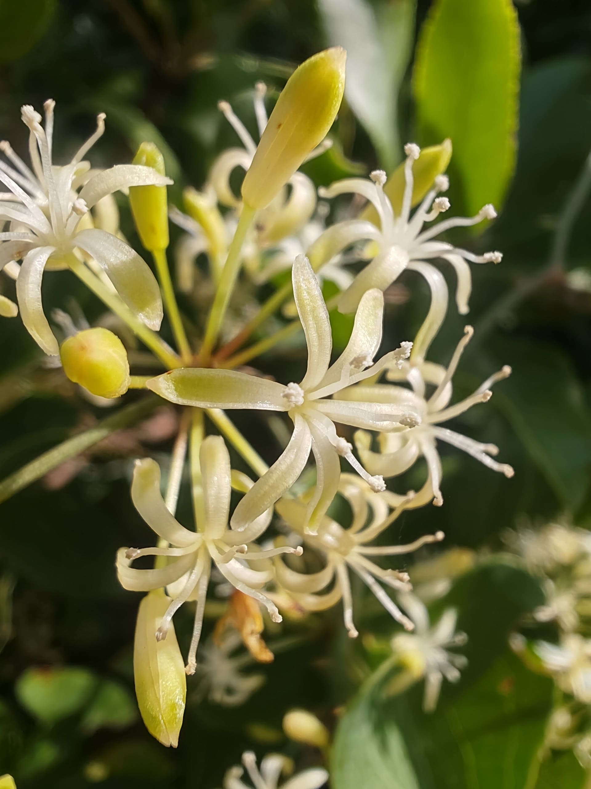Les petites fleurs dioïques, d’une teinte jaune-verdâtre, sont regroupées en grappes flexueuses. Les fleurs mâles possèdent 6 étamines libres fixées à la base du périanthe, tandis que les fleurs femelles présentent 3 stigmates recourbés mais pas de style. La floraison a lieu d’août à octobre.